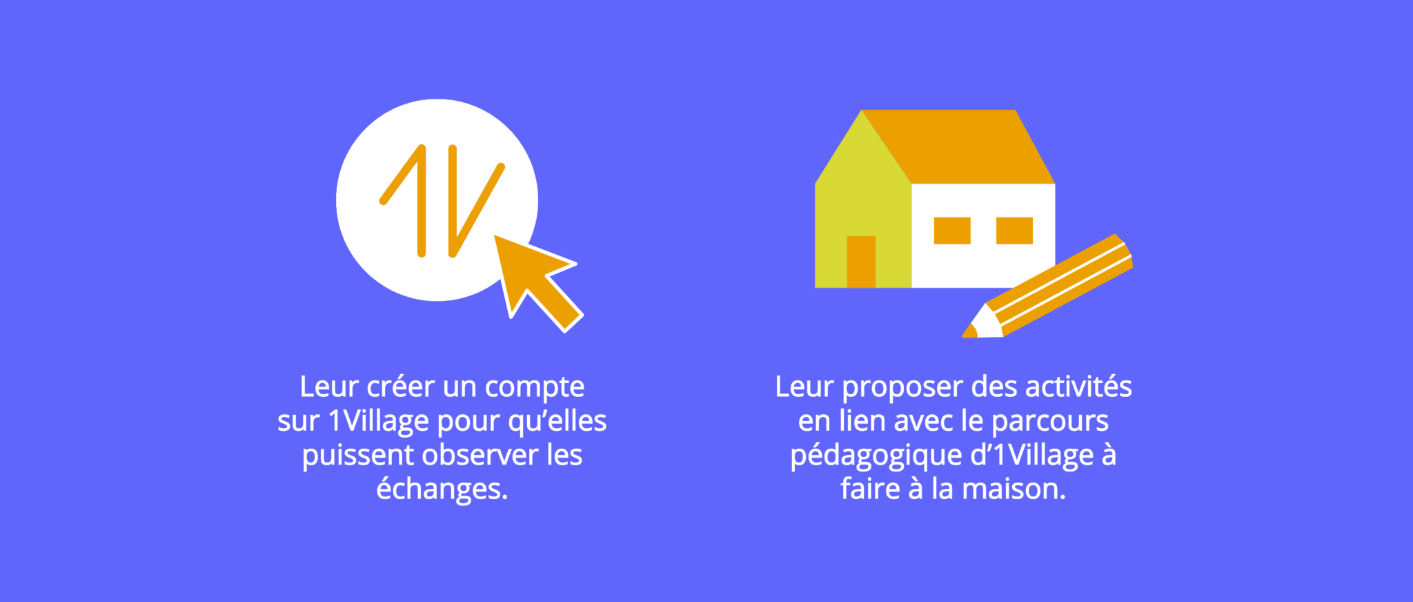 L’équipe pédagogique anime un projet local d’animation d’ateliers pédagogiques qui accompagne certaines classes françaises participant à 1Village pour aller plus loin dans leurs apprentissages issus des échanges. À travers ces ateliers, l’équipe pédagogique pousse les écoliers à se questionner sur leur identité culturelle et leur perception du monde, via différents modules : développement durable, égalité fille-garçon, éducation aux médias et à l’information, …Ces ateliers sont l’occasion de développer des fiches pédagogiques qui sont ensuite partagées à tous les enseignants participant à 1Village.